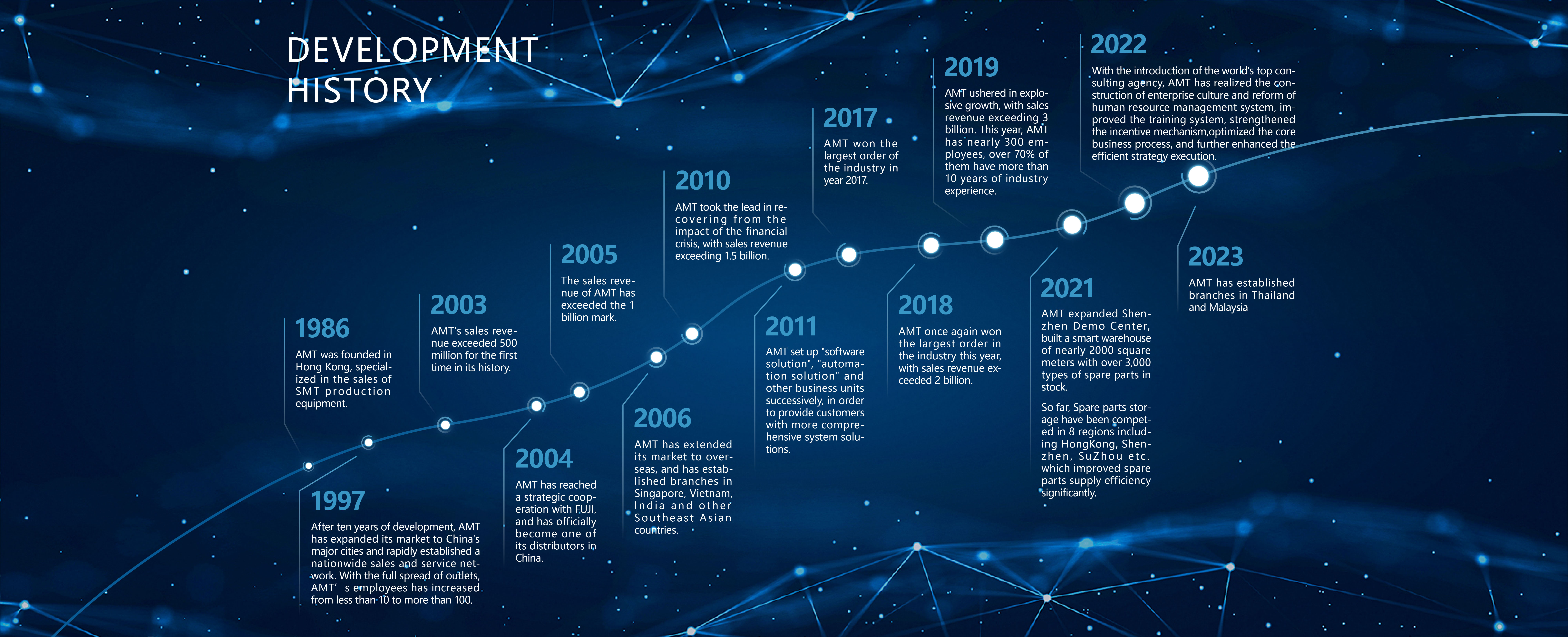 AMT ushered in explosive growth, with sales revenue exceeding 3 billion. This year, AMT has nearly 300 employees, over 70% of them have more than 10 years of industry experience. been competed in 8 regions including HongKong Shenzhen, SuZhou etc. which improved spare parts supply efficiency significantly.